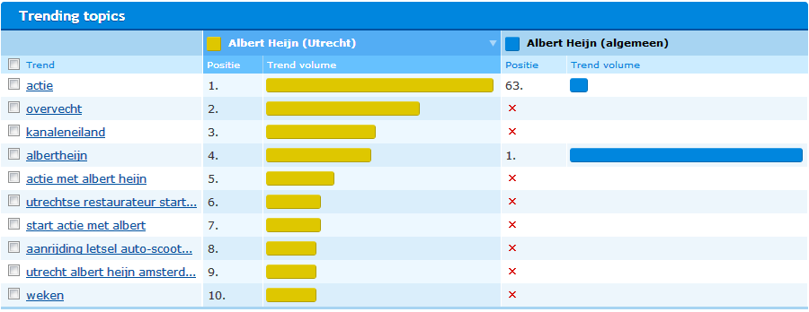 In de onderstaande afbeelding zijn de trending topics van Albert Heijn in combinatie met Utrecht vergeleken met Albert Heijn in het algemeen. Ik zie dat veel mensen het over ‘actie’ hebben in relatie tot Albert Heijn en Utrecht, terwijl over Albert Heijn in het algemeen dit slechts 63e staat op de lijst van trending topics. Kortom, plaatselijke acties (in dit geval werd veel gesproken over een actie voor de voedselbank) lijken te lonen bij Albert Heijn in Utrecht!