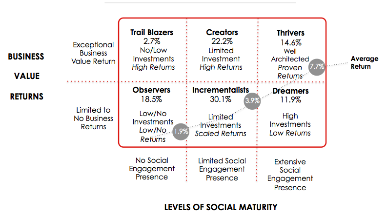 De resultaten van het onderzoek worden in het volgende model samengevat waarin ze stellen dat Socially Engaged’Companies See 4X Greater Business Impact: