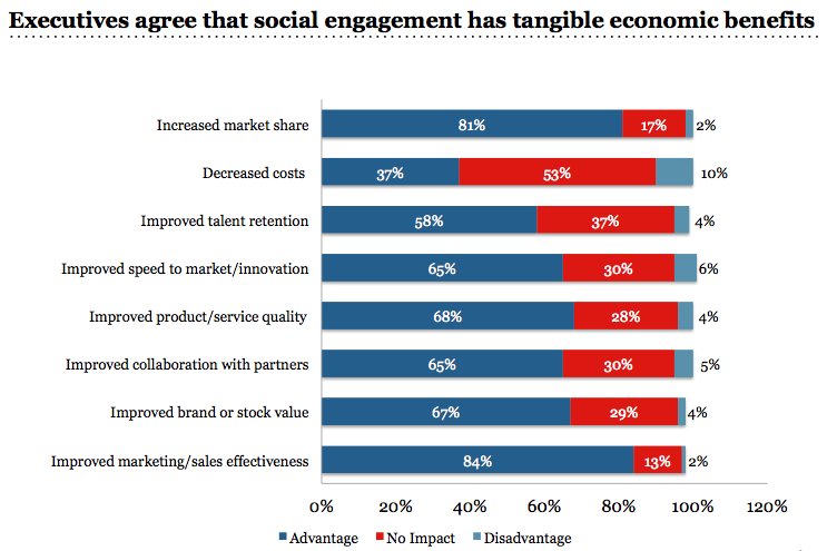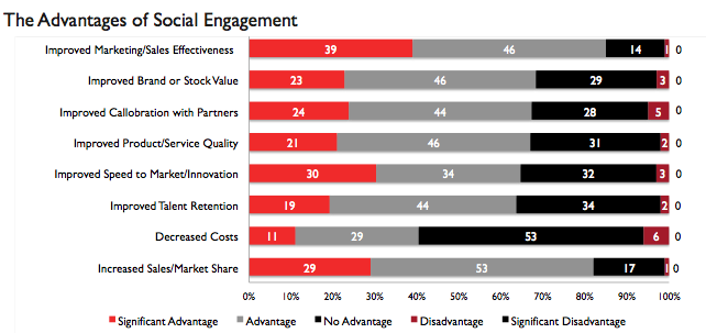 Volgens het onderzoek liggen de voordelen van social engagement op: verbeterde effectiviteit van Marketing & Sales, verhoogde merkwaarde, betere samenwerking met partners, betere productkwaliteit en dienstverlening, snellere time tot market/innovatie en een groter marktaandeel. En laten we eerlijk zijn, wie wil dit niet allemaal ook?