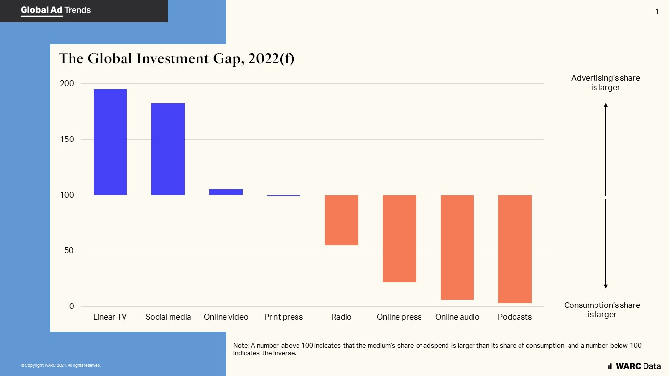 Podcasts blijken met 40 miljard dollar juist ondergewaardeerd, met de grootste kansen voor adverteerders die doelgroepen van 16-24 jaar zoeken, middeninkomens en mensen met een lagere opleiding. Ook nieuwsmedia komen er bekaaid vanaf. Adverteerders zouden volgend jaar wereldwijd 58,0 miljard euro moeten uitgeven aan online pers om gelijke tred te houden met het consumptieniveau. In plaats daarvan bedragen de verwachte uitgaven slechts 12,8 miljard dollar.