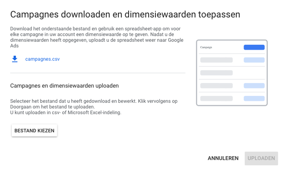 “# Voeg voor elke campagne één aangepaste dimensiewaarde toe. U kunt dezelfde waarde in meerdere rijen herhalen. Als u geen waarde wilt toepassen op een campagne laat u “–” in een cel staan of verwijdert u de content van de cel.