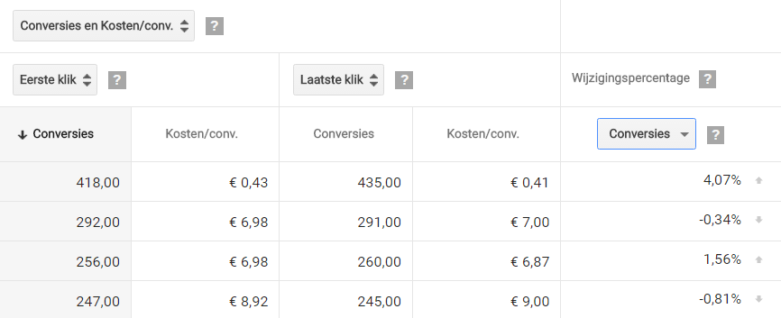 Dat zijn rapportages waarmee je de effectiviteit kunt analyseren aan de hand van verschillende attributiemodellen. Wanneer en hoe veel conversiewaarde geef je aan een AdWords-bezoek op basis van de laatste klik, eerste klik, lineair, enzovoorts?