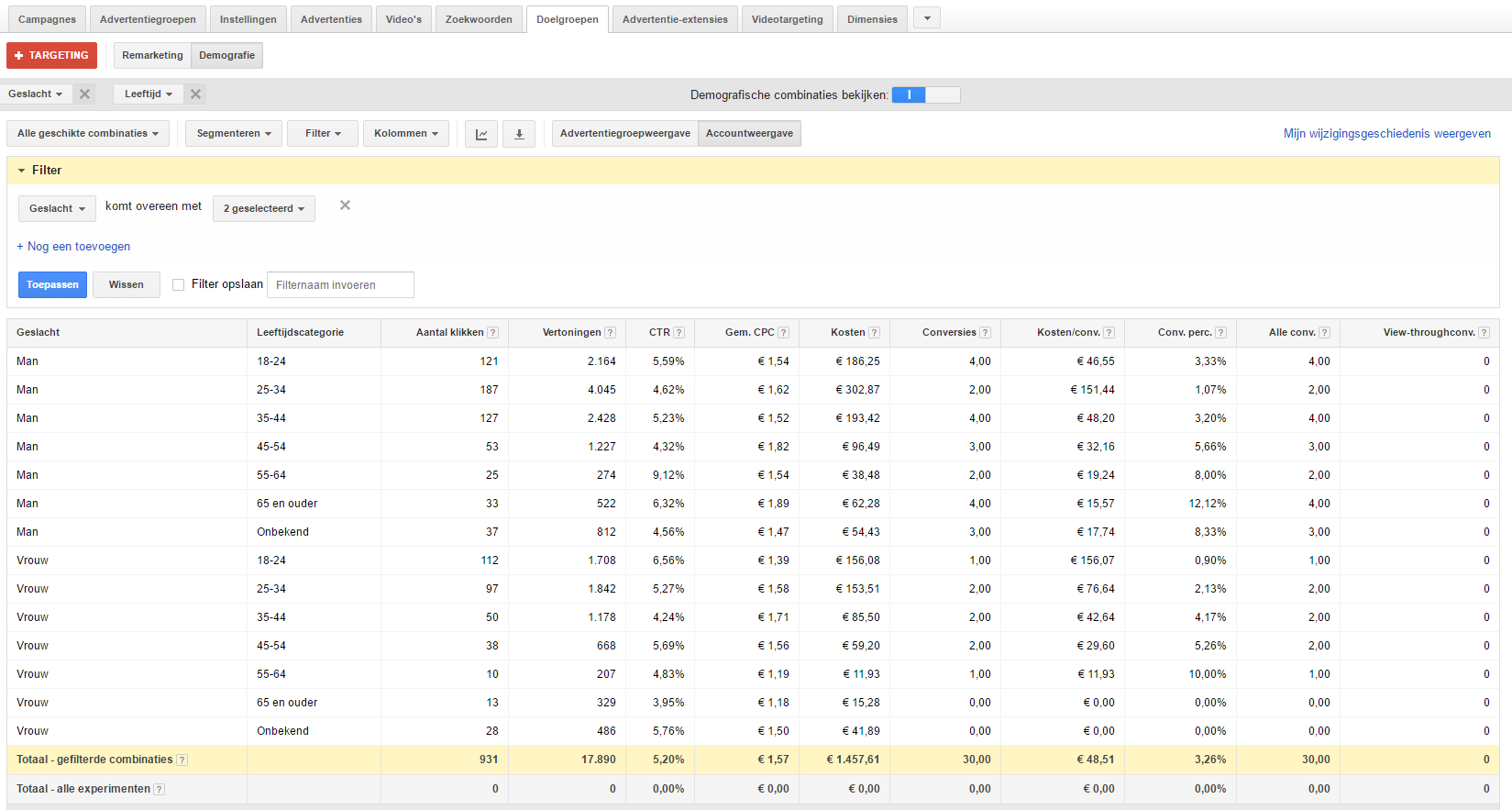 Verder zijn nu ook demografische gegevens voor zoekadvertenties (DFSA) beschikbaar. Je kunt onder doelgroepen bodaanpassingen instellen aan de hand van leeftijd en geslacht. DFSA geeft ook de mogelijkheid doelgroepen gericht te targeten of uit te sluiten.