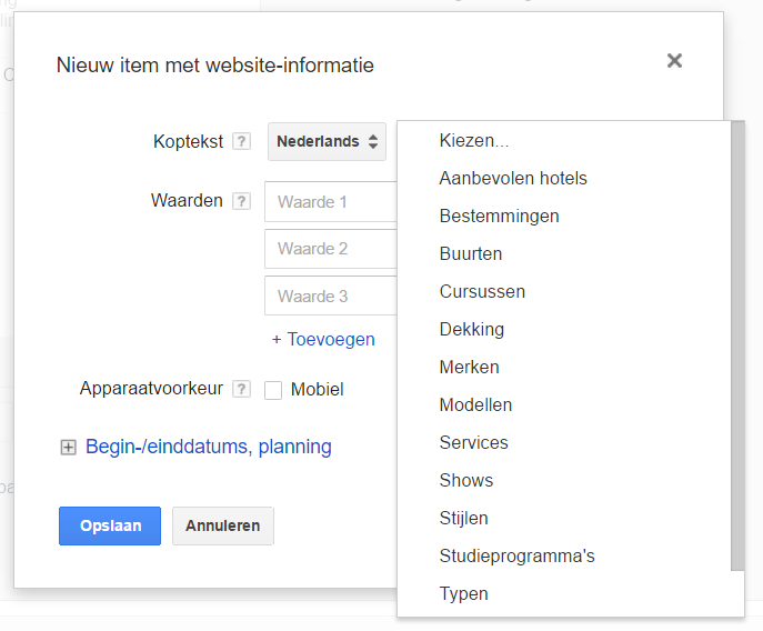 Er waren al advertentie-extensies, zoals bijvoorbeeld sitelinks, locatie, oproepextensies en highlight-extensies. Daar komt deze nieuwe extensie bij, beschikbaar op accountniveau of specifiek per campagne. De extensie voor website-informatie bevat informatie aan de hand van categorieën, zoals bijvoorbeeld merken, bestemmingen of producttypen. De waarden bepaal jezelf.