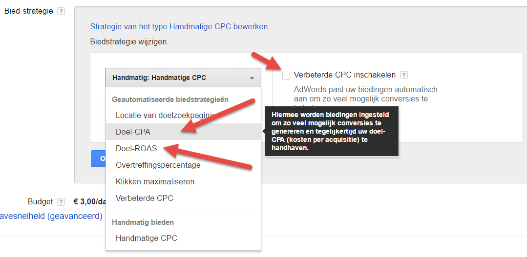 Google gebruikt machine learning om campagnes beter te laten presteren. Je stelt daarvoor de doel-CPA, doel-ROAS of verbeterde CPC in.