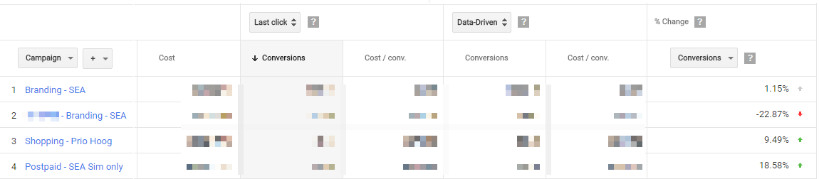 5. In de laatste kolom, Conversions, kun je vervolgens zien in welke mate campagnes meer of minder conversies toegeschreven krijgen met het data driven-model ten opzichte van het last click-model en vice versa.