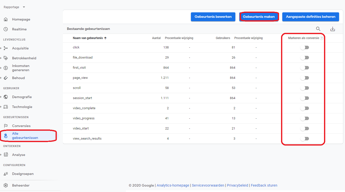 De statistieken die standaard in GA4 staan, zijn de voorgedefinieerde gebeurtenissen. Deze zijn te zien in de afbeelding hieronder. Door gebeurtenissen toe te voegen die voor jou relevant zijn, maak je de statistieken in GA4 relevanter voor jouw specifieke situatie. Daarvoor gebruik je de button ‘Gebeurtenis maken’. Deze button is omcirkeld. En iedere gebeurtenis kun je aanmerken als conversie.