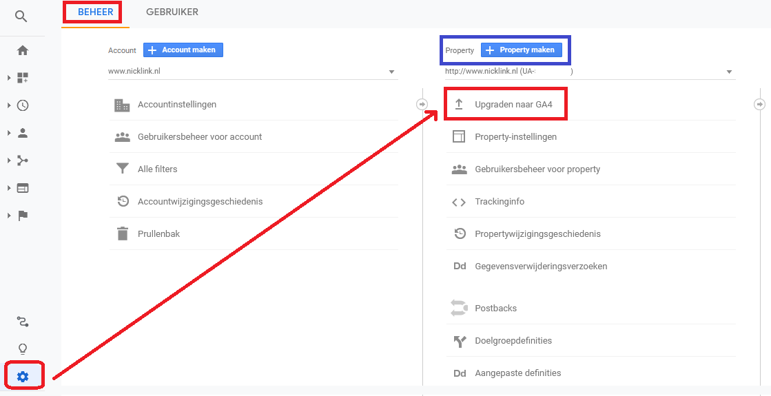Waarom toch alvast gaan werken met GA4? Omdat het de toekomst is. Het wordt de komende tijd verder uitgebouwd. En GA4 wordt ‘slimmer’ dankzij artifical Intelligence (AI). En de data van GA4 leert de AI ‘leert’ steeds betere voorspellingen te doen. Je hoeft voor het upgraden, al dan niet via een nieuwe property, niets te installeren. Mits je gebruik maakt van gtag.js. Zie ook de uitgebreide handleiding van Google. Ga voor upgraden of het aanmaken van een property in het account naar de beheeromgeving. De button daarvoor bevindt zich onderaan in het menu. Zie ook onderstaande afbeelding.