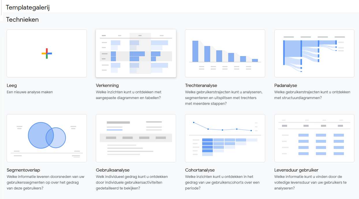 Alle bekende rapporten uit Google Analytics zijn terug te vinden in de template galerij. Deze is ook te vinden in de categorie ‘Analyse’.