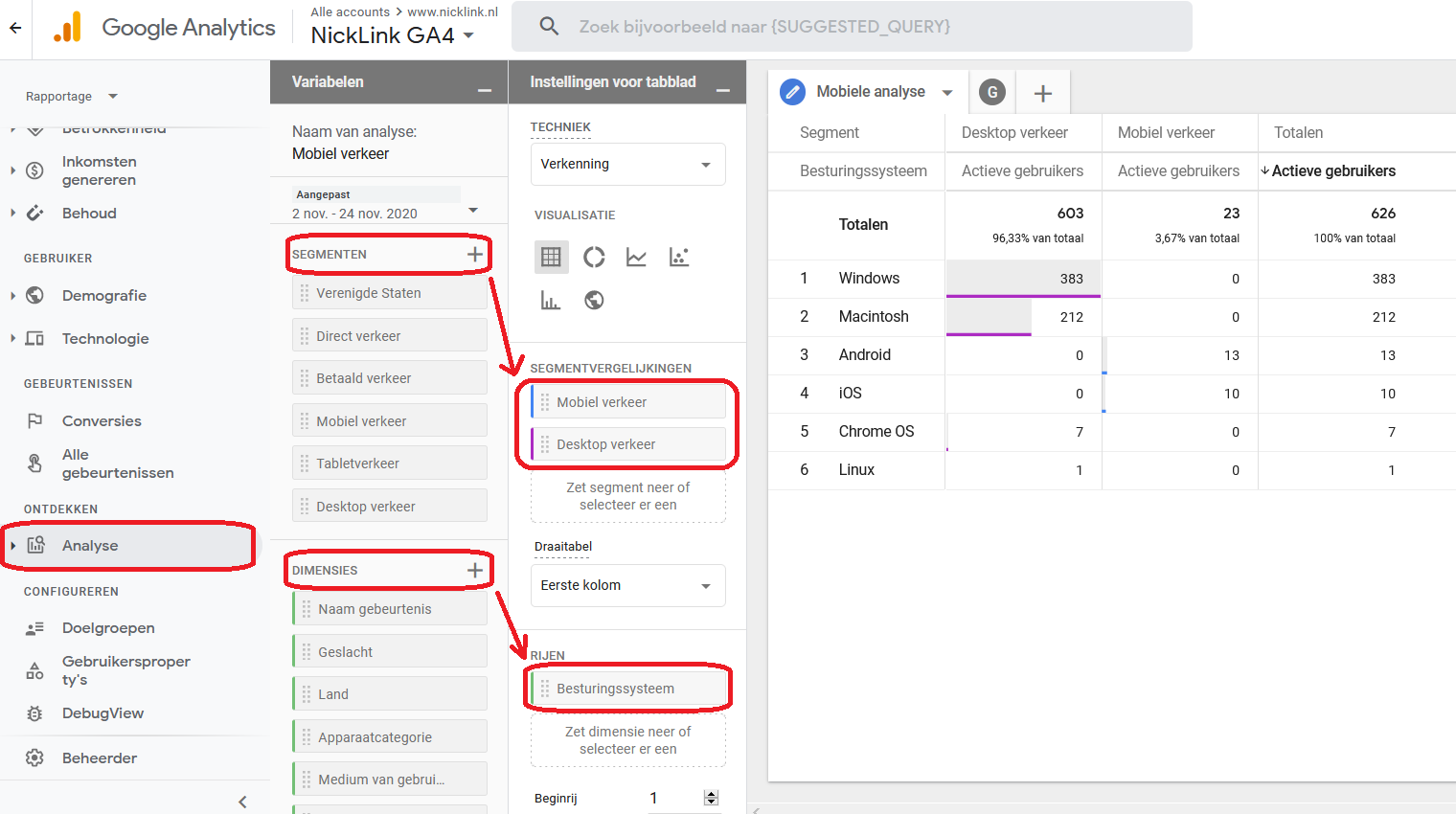 Google Analytics kent onder het rapport ‘Aanpassing’ een aantal opties om dashboards en rapporten te maken. In GA4 is die optie te vinden onder ‘Ontdekken’. De rapporten voldoen, maar de rapportagefunctie is niet heel uittgebreid. Eigenlijk is dat ook niet heel vreemd, want Google heeft natuurlijk zijn Data Studio om rapportages te maken ‘voor publiek’. Toch valt er best veel te ‘ontdekken’. In het voorbeeld hieronder heb ik in de ‘analysehub’ (onder het omcirkelde rapport ‘analyse’) een overzicht gemaakt van besturingssystemen bij desktop- en mobiele gebruikers.