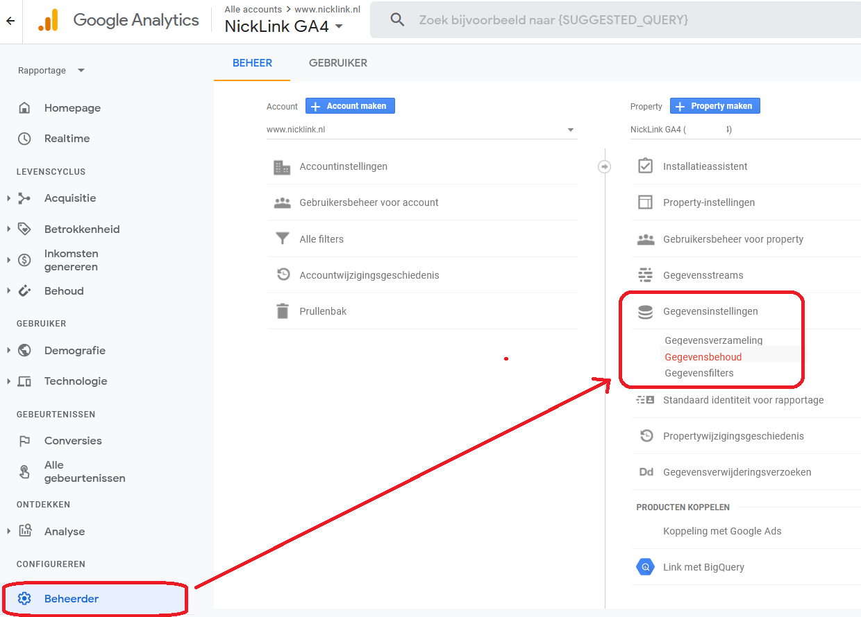 De privacy van gebruikers is in GA4 beter geregeld. Toch zijn er een paar dingen die je nog wel even wilt bekijken. Je vindt de privacyinstellingen via ‘beheer’ en dan ‘gegevensinstellingen. Zie de afbeelding hieronder.