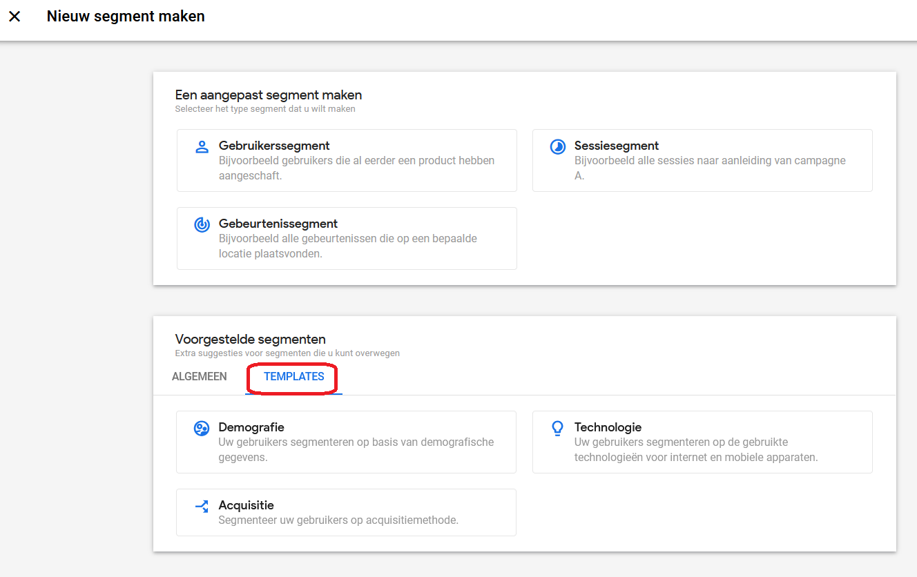 De templates (omcirkeld) zijn het meest voorgestructureerd en daarom het meest toegankelijk om mee te beginnen. Hoewel ook het samenstellen van de aangepaste segmenten zichzelf redelijk wijst. Zowel bij de aangepaste segmenten als bij de tempates verschijnt een overzicht van eigenschappen als je doorklikt. Je geeft aan welke eigenschappen je toevoegt of uitsluit voor het segment. En zo baken je het segment af.