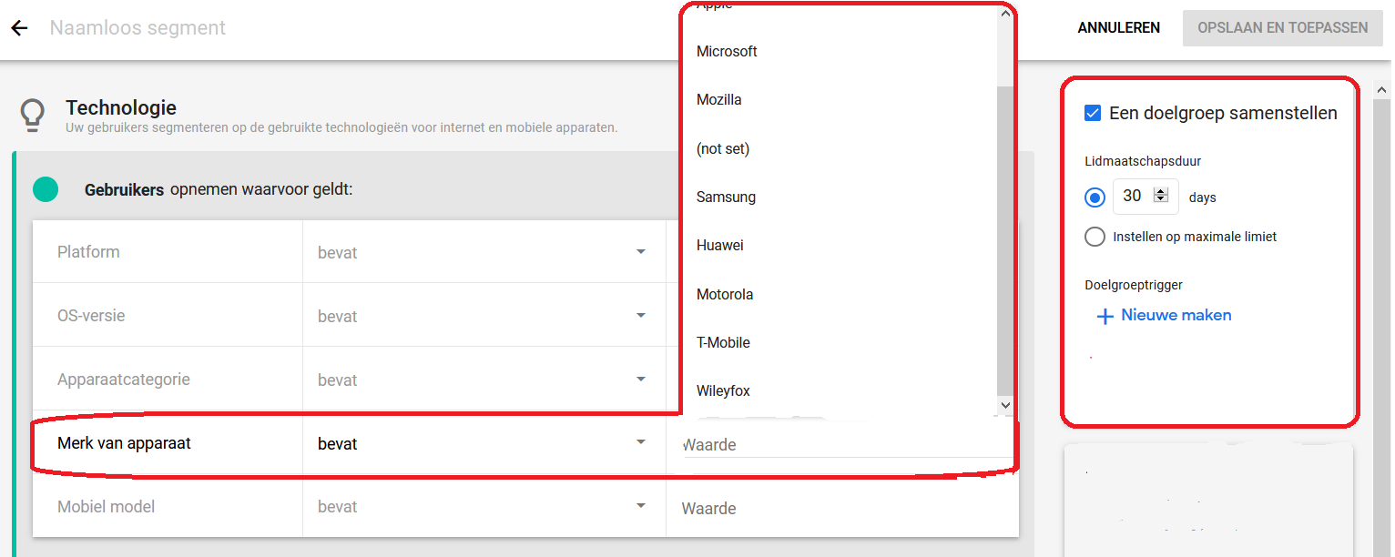 Keuzeopties in template voor segment ’technologie’, inclusief doelgroep samenstellen