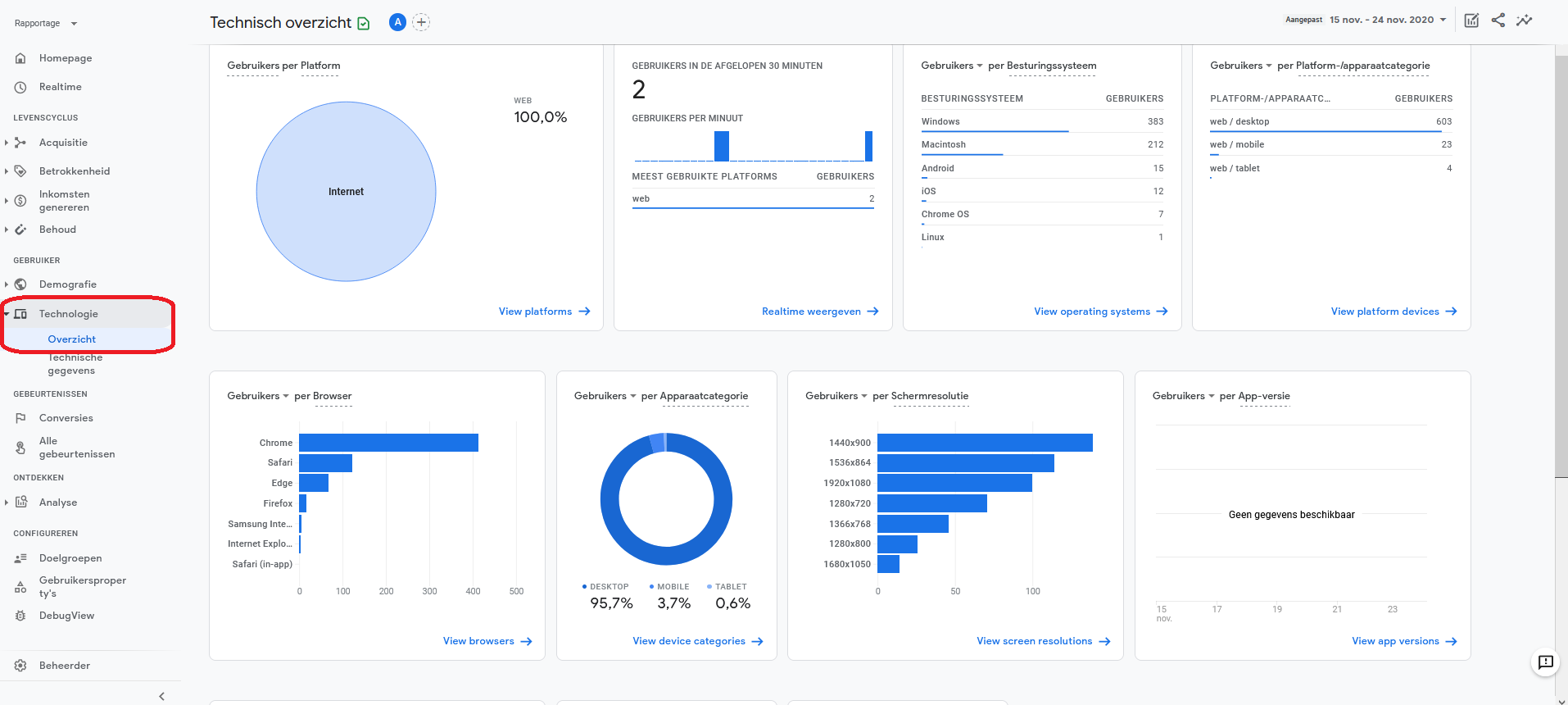 Rapport ’technologie’ in categorie ‘gebruikers’ GA4