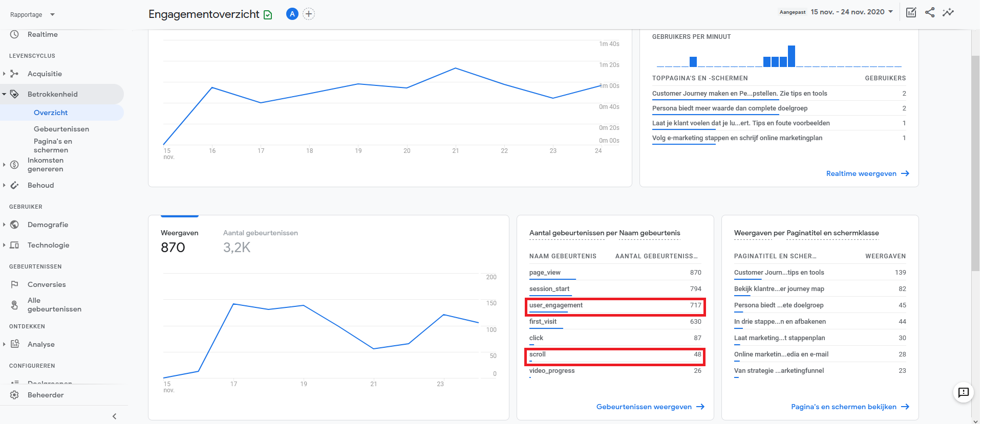 Onder elk van de onderwerpen hangen twee à drie rapporten. Daarop is veel kernachtiger informatie over de gebruikers samengebracht in de getoonde grafieken én statistieken. Zoals de omcirkelde ‘user engagement’ en ‘scroll’. Over deze statistieken later meer. Zie hieronder een voorbeeld van het rapport betrokkenheid.