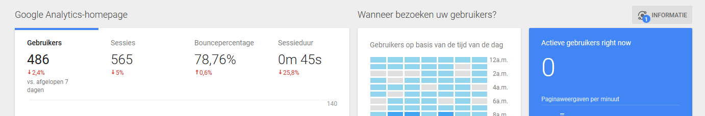 Voor we aan de slag gaan met Analytics Intelligence, is het handig om te weten hoe je deze feature opent. Analytics Intelligence is te openen door in het Google Analytics account onder ‘Home’ rechtsboven op ‘Intelligence’ of ‘Informatie’ te klikken: