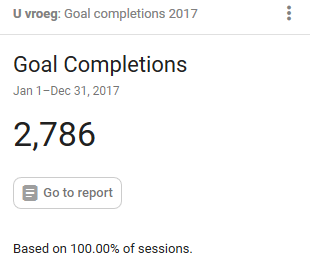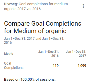 De meeste websites hebben inmiddels doelen ingesteld. Zo ook klant X. Om te achterhalen of de SEO optimalisatie van de afgelopen maanden succesvol is, wil klant X weten of het aantal behaalde doelen in 2017 is gestegen ten opzichte van 2016 (toen hij nog niks aan SEO deed).