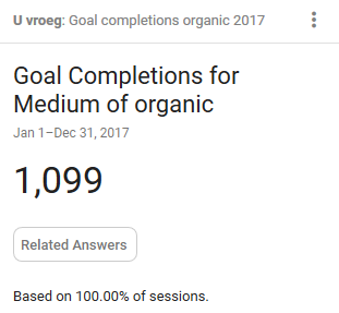 In de periode januari – december 2017 zijn maar liefst 2.786 doelen behaald. Dit klinkt groots, maar dit zegt nog niks over een (eventuele) verbetering en uit welk verkeer deze behaalde doelen komen. Daarom moet ik specifiekere vragen stellen. Om alleen behaalde doelen uit organisch verkeer te meten stel ik de volgende vraag: ‘Goal completions organic 2017’. De Analytics Intelligence meldt dat mijn vraag te vaag is en past de vraagstelling automatisch (en goed!) aan.