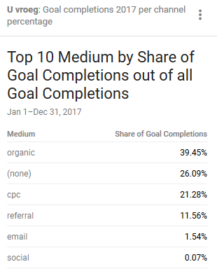 Ik weet nu dat er in 2017 2.786 doelen zijn behaald waarvan 1.099 uit organisch verkeer. Nu ik toch aan het analyseren ben, wil ik weten hoe afhankelijk mijn klant is van het organisch verkeer (en dus de SEO-werkzaamheden). Daarom stel ik de volgende vraag: ‘Goal completions 2017 per channel percentage’. Ik zet het percentage erbij, zodat ik makkelijk kan zien hoe groot het relatieve aandeel is.