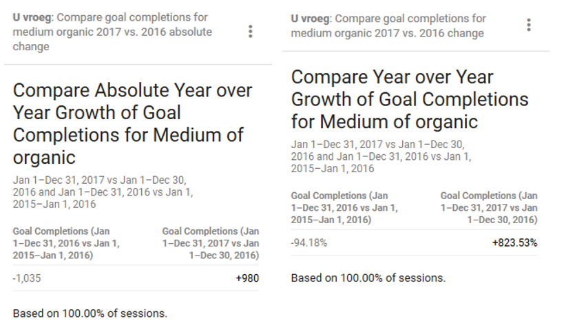 Nu heb ik het aantal behaalde doelen in 2016 en in 2017. Ik zou de absolute- en relatieve verandering handmatig met een rekenmachine kunnen meten, maar ik kan het ook aan Analytics Intelligence overlaten. Hiervoor moet ik twee vragen stellen:
