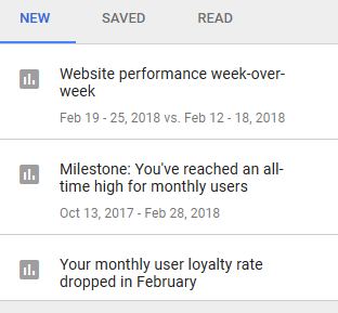 Het eerste wat je te zien krijgt als je de Intelligence functie opent zijn de insights. Erg handig, omdat je naast de percentages uit standaard rapporten, vanaf nu ook wordt geconfronteerd met berichten over gebeurtenissen op je website waar je zelf in eerste instantie niet aan zou denken. De insights in het voorbeeld hieronder geven de meldingen: ‘website performance week-over-week’. Dit is een automatisch gegenereerd rapport waar je direct ziet hoe de website scoort ten opzichte van de week ervoor. Daarnaast weet je door de insights dat de afgelopen maand de meest succesvolle maand ooit was op het gebied van gebruikers en dat de loyaliteit is gedaald in februari.