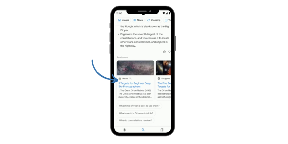 Een plek op een prime-time positie om zichtbaar te zijn met je content. De cruciale vraag is: valt Bard zodanig in de smaak dat de consument zich daarop focust en vervolgvragen stelt of vindt de consument het stiekem heel fijn om verder te lezen op een van deze websites? Andersom kun je op zich ook verwachten dat verkeer naar productpagina’s overeind zou moeten blijven staan, die intentie kan Bard namelijk niet overnemen.