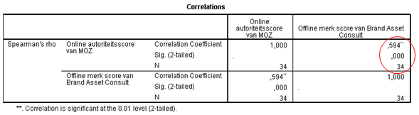De tabel laat zien dat er inderdaad sprake is van een (sterke) positieve samenhang tussen de brandasset score en domain authority (score = 0,584, deze score is 100% significant).