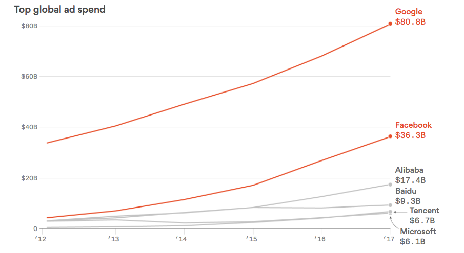 Wat is er aan de hand? Momenteel hebben de bovengenoemde vijf bedrijven de advertentiemarkt bij de keel. Dit jaar gaat tweederde van alle dollars die wereldwijd worden uitgegeven aan advertenties naar ‘De Grote Vijf’: Google, Facebook, Tencent, Baidu en Alibaba. Dat blijkt uit de Entertainment and Media Global Outlook van PwC.