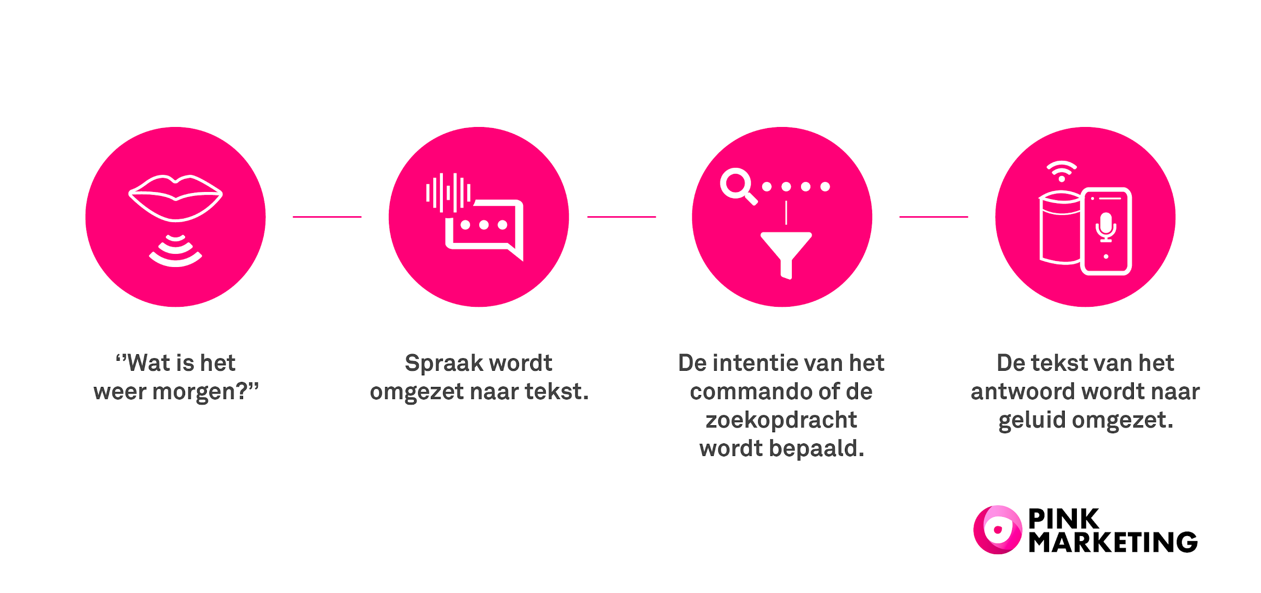 Apple’s Siri, Amazons Alexa en Google Assistant, het zijn enkele voorbeelden van zoekmachines die voice search bedienen. De werking van een gesproken zoekopdracht via Voice Search is op onderstaande afbeelding uitgelegd.