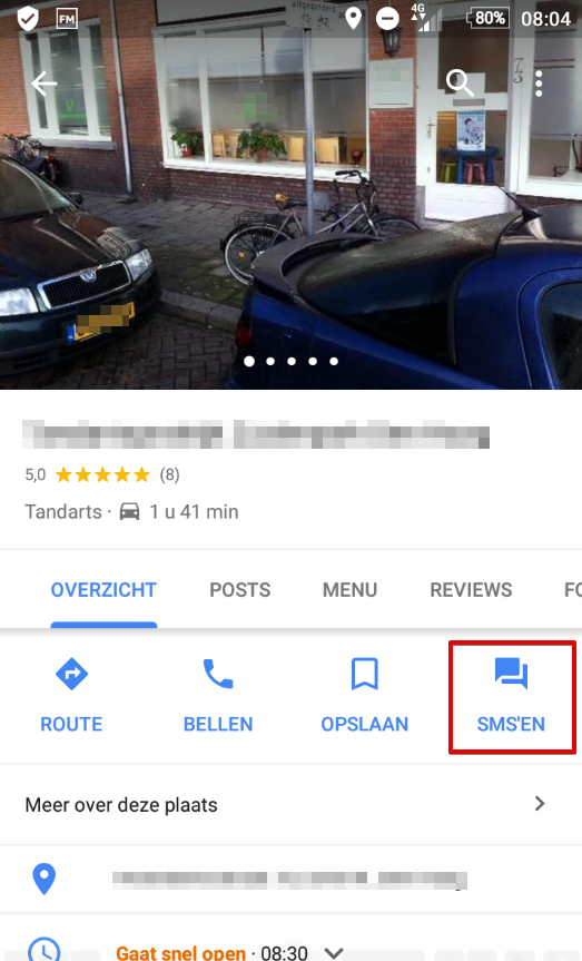 Klanten die je bedrijf hebben gevonden in de Google Maps-app zien het tabje Berichten (iOS) of Sms’en (Android) in de Google Mijn Bedrijf-vermelding. Als bezoekers op het berichten- of sms-tabje klikken om een bericht te sturen, wordt er automatisch een welkomstbericht getoond, die je als bedrijfseigenaar via de Google Mijn Bedrijf-app instelt.