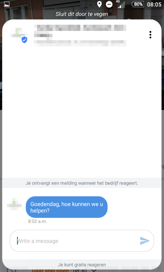 - Er verschijnt een pop-up met de melding dat het bedrijf beschikbaar is voor berichten