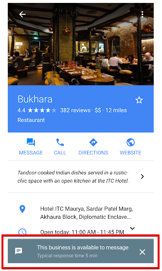 Google Mijn Bedrijf-vermelding met pop-up: bedrijf is beschikbaar voor berichten en gemiddelde reactietijd is 5 minuten