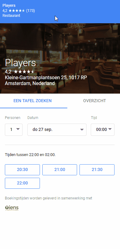 Wil je gebruikmaken van de functie Boekingen? Meld je dan aan bij één van de Google-partners. Op Google.com vind je een overzicht van de partijen die met Google samenwerken (de zogenaamde planningpartners) en waar een directe koppeling voor boekingen mogelijk is. Momenteel werkt Google bijvoorbeeld al samen met Iens, Treatwell en Quandoo. Binnenkort zal ook Tripadvisor Experiences worden toegevoegd aan de planningpartners.