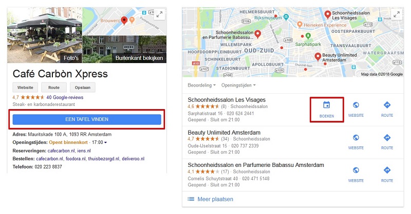 De boekingsfunctie bij een bedrijfsvermelding (links) en in de lokale zoekresultaten (rechts)