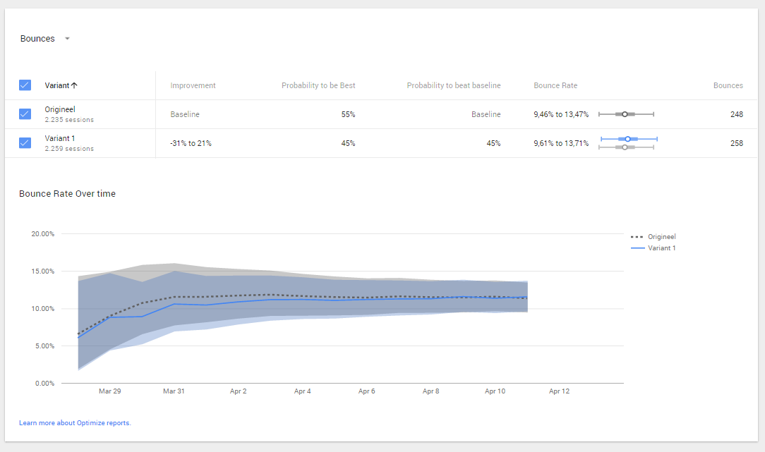 Na het opzetten van de verschillende testen ben je natuurlijk benieuwd naar de rapportage. Ook dit stuk hebben we onder de loep genomen. In een duidelijk overzicht bovenaan de pagina zie je na de start van een experiment in één oogopslag welke variant het beste resultaat oplevert. In het verbeteringsoverzicht daaronder geeft Optimize vervolgens meer details en zijn de prestaties van het origineel met de variant vergeleken.