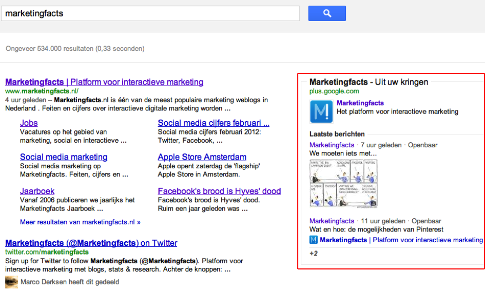 Ik ga de discussie over het succes of de #fail van Google+ in deze blog niet aan. Maar zelfs als je niet geloof in het sociale netwerk Google+ blijft het vanwege de integratie met andere Google producten interessant om up-to-date informatie op je Google+ pagina te hebben. Zie bijvoorbeeld onderstaand screenshot van de zoekmachine, die de laatste twee updates (inclusief afbeeldingen) van een pagina weergeeft: