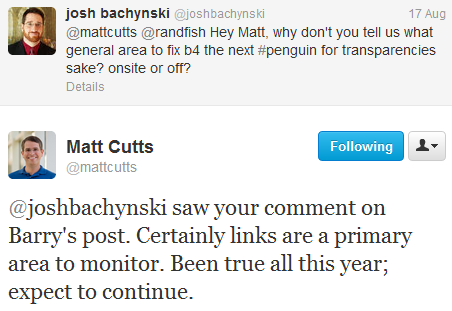 Cutts zegt hier echter wel dat er voornamelijk naar links wordt gekeken. Feitelijk zegt hij dat Penguin zich in mindere mate ook bezighoudt met on-site factoren. Dit zal waarschijnlijk te maken met de interne linkstructuur, welke vooral op de gebruiker gericht moet zijn en blijven. Denk hierbij aan footers overmatig gevuld met een dosis spammy links. De hoofdfocus van Penguin zal echter de externe links blijven.