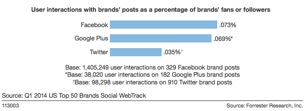 Volgens Forrester is de betrokkenheid bij het merk op Google+ twee maal zo waardevol als die van Twitter. De belangrijkste ‘maar’ is wel dat het sociale netwerk van Google qua aantal gebruikers en de intensiteit van het gebruik nog steeds niet in de buurt komt van Facebook. Het onderzoek geeft aan dat: