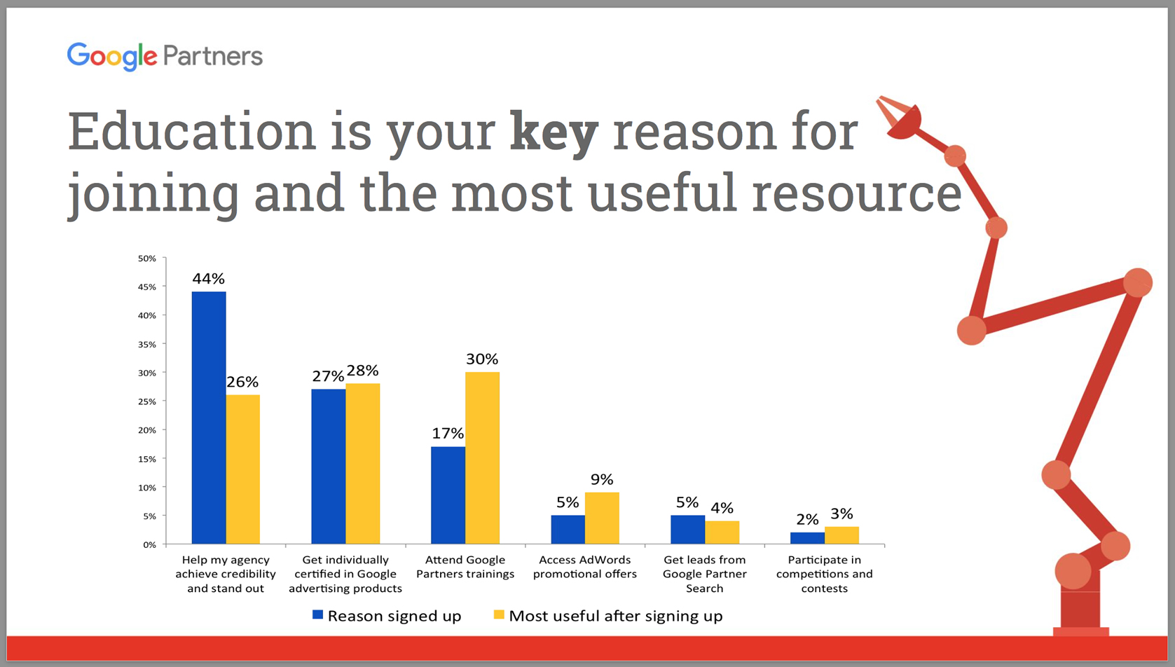 - Education – opleiding bleek de hoofdreden te zijn om een Google Partner te worden en werd ook daarna door de partners als belangrijkste bron gezien. Ook dit jaar werd Google Insights gelanceerd. Een digitale vraagbaak exclusief voor Partners. Nog in ontwikkeling is Adwords Fundamentals, een online examen dat je ook weer aardig wat exposure kan geven bij je eigen acquisitie. Als je het haalt natuurlijk.
