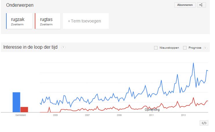 - Zoek naar synoniemen. In het voorbeeld van de rugzak is een rugtas exact hetzelfde, maar een compleet ander zoekwoord. Houd hier dus ook rekening mee en test eventueel met deze verschillende varianten. Je mag nooit 1 product meerdere malen in de feed opnemen dus moet je kiezen. Denk bij het optimaliseren van de feed altijd als een gebruiker, net zoals je dat doet bij het inzetten van AdWords campagnes. Hierbij kun je gebruik maken van diverse hulpprogramma’s zoals Google Trends, AdWords zoekwoordplanner en je eigen AdWords data.