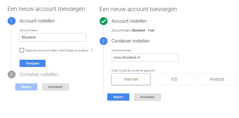 Ga naar Google Tag Manager en klik op ‘Nu registeren’. Tip: gebruik hiervoor je huidige Google account, die ook gebruikt wordt voor bijvoorbeeld Google Analytics. Vervolgens ben je ingelogd en klik je op ‘Account maken’.