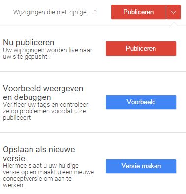 Voordat je jouw aangemaakte tags publiceert, adviseer ik om deze eerst grondig te testen, voordat je eventuele data vervuilt in Google Analytics. Dit kan met de ingebouwde debugger. Deze functie vind je rechtsboven in Google Tag Manager onder ‘Publiceren’.