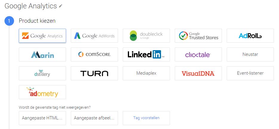 In dit voorbeeld laten we zien hoe je Google Analytics via Google Tag Manager op je website toevoegt. Klik bij ‘Tags’ op ‘Nieuw’ en geef je tag een herkenbare naam, bijvoorbeeld ‘Google Analytics’. Kies daarna bij ‘Product kiezen’ voor Google Analytics.