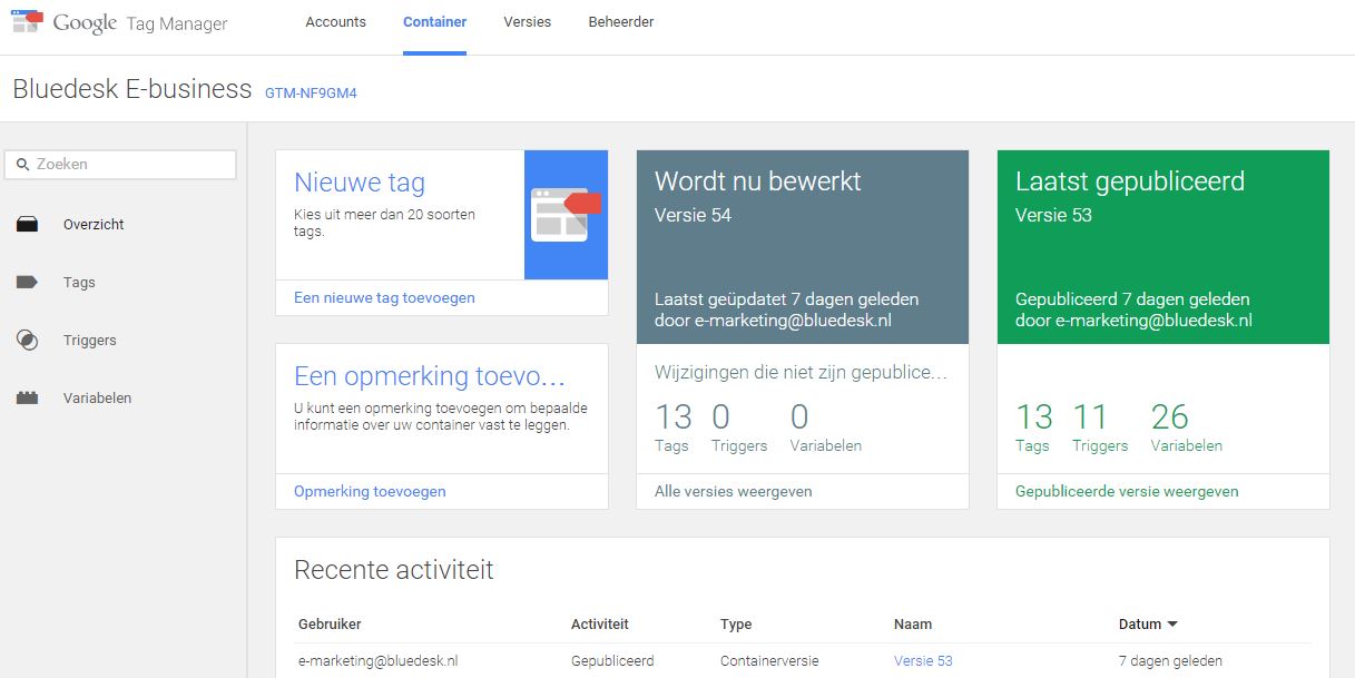 Bij het aanmaken van een nieuw account zul je automatisch van V2 gebruik maken. Google Tag Manager V2 brengt de volgende wijzigingen met zich mee: