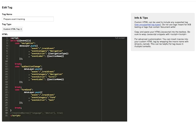Het is nu dus mogelijk om informatie over vrijwel alle interacties op de website te gebruiken in Google Tag Manager, zonder dat hiervoor additionele javascriptcodering nodig is. Er zijn 4 verschillende tag-templates beschikbaar in Google Tag Manager: click listener, form submit listener, link click listener en timer listener. Hierdoor is het nog eenvoudiger geworden om externe links, PDF’s, video’s, formulieren, etc. te meten, waardoor er meer tijd overblijft voor analyse. Naast het gemak bespaart deze nieuwe GTM-functionaliteit ook kosten, omdat je je webbouwer hiervoor niet meer nodig hebt.