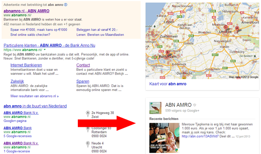 Marketing-minded Nederland heeft, als het realistisch kijkt, in ieder geval geen keuze meer. Het moet aan de slag met Google+. Eerder werd het geïntegreerd in Google Places, ook wel bedrijfspagina’s. Nu de knowledge graph is geïntegreerd, krijgt Google+ een nadrukkelijkere rol. Er wordt namelijk, wanneer mogelijk, een koppeling gemaakt met je Google+-pagina. Daarnaast wordt het laatste Google+-bericht getoond, zoals te zien in het onderstaande voorbeeld.
