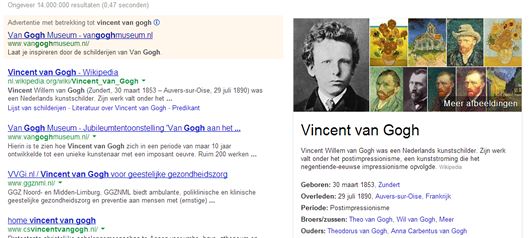 De Knowledge Graph is bedacht om, zonder te klikken op een zoekresultaat, direct op de eerste pagina de belangrijkste resultaten te tonen. Google maakt hierbij gebruik van verschillende databronnen zoals bijvoorbeeld Wikipedia. De knowledge graph bestaat al langer. Op Google.com kon je eerder via Engelstalige instellingen de veranderingen aan zien komen. Deze aanpassing is nu ook in Nederland te ervaren via Google Chrome. Het is nog even wachten totdat de veranderingen ook in andere browsers zichtbaar worden.