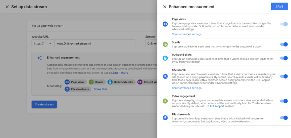 Enhanced Measurement is een nieuwe functie die luistert naar een paar van de meest voorkomende website-gebeurtenissen zoals scroll-tracking en Outbound Link Tracking. Je kunt deze instellingen vinden onder ‘Data Streams’ in je Admin-scherm bij ‘Property’.