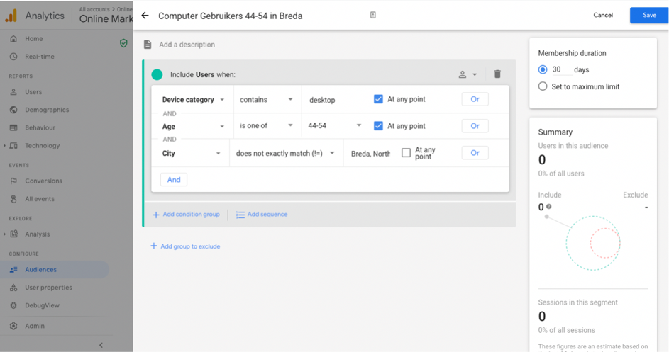 In de nieuwe omgeving is ook een nieuwe Audience Builder toegevoegd met speciale Web + App-eigenschappen. Dit is ter vervanging van de zogenaamde ‘Advanced Segment’-builder in de Universal Google Analytics. De mogelijkheden om doelgroepen te bouwen zijn hier eindeloos, een doorgewinterde data-analist zal hier ongetwijfeld erg enthousiast van worden.