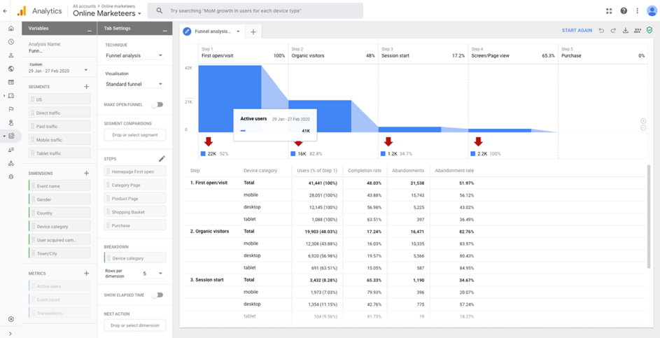 Identificeer de belangrijke stappen voor een conversie en begrijp hoe gebruikers daartussen navigeren. Dus waar komen ze binnen in je funnel en waar haken ze af?